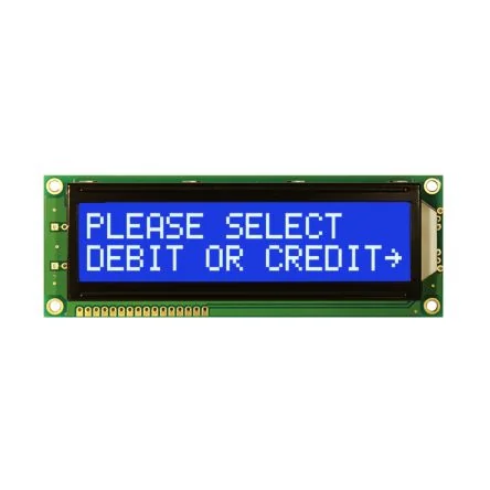 High-quality alphanumeric LCD display with white on blue design, ideal for clear visibility.