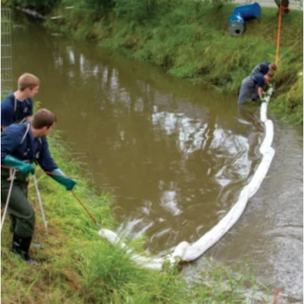 Spaghetti-strip filler material absorbs thick oily liquids but repels water; UV-resistant mesh envelope lets oil penetrate and is then absorbed. Metal hooks and rings for greater strength during deployment and recovery. Will not sink, even when saturated. Note: Not recommended for use on land. Oil-Only PIG Booms are recommended for land-based applications.