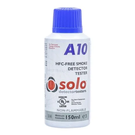 Solo A10 Non-Flammable Smoke AerosolNon-Flammable Smoke Aerosol (150ml) for Dispenser Use. Designed for use with the Solo aerosol dispenser, the aerosol creates particles replicating those found in smoke to allow a functional test of smoke detectors. A non-flammable, HFC Free product, Solo smoke aerosol offers fast activation and clearing of detectors with no harmful residue.Detector Test and MaintenanceTest equipment must be proven to be safe for the engineer and the system, it needs to be cost-effective, versatile, portable, approved by detector manufacturers and in compliance with international codes and standards.