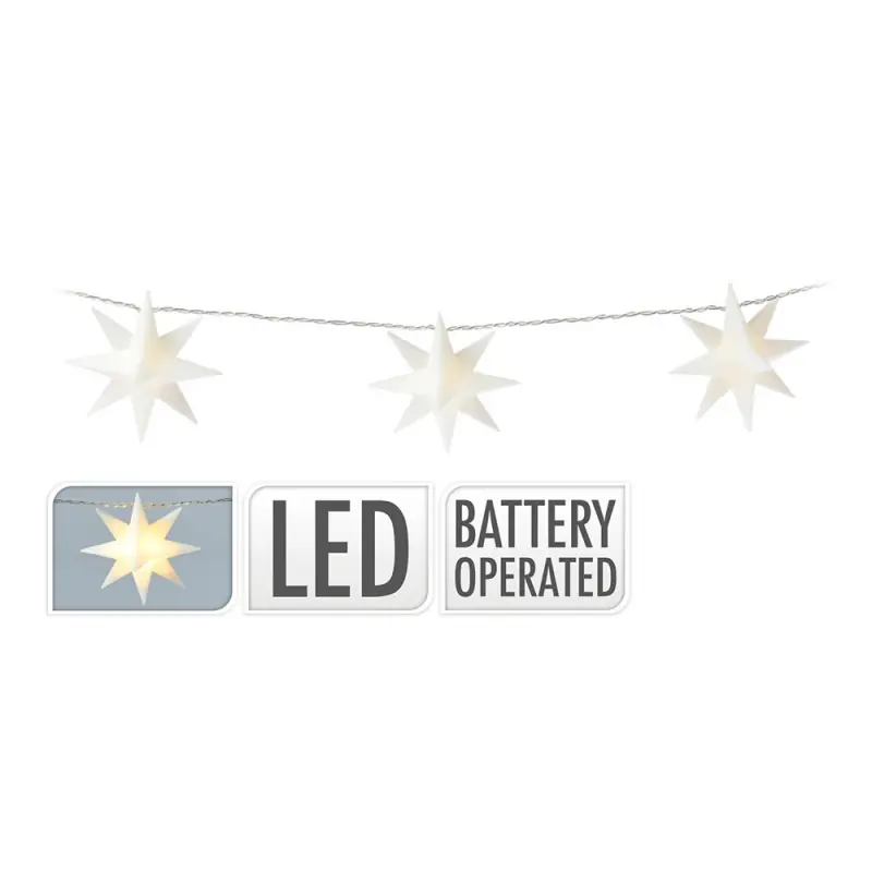 Decorative star garland 10 LEDs warm white light. Star ø8cm. Distance between lights 15cm. Cable length 30cm. Operates with 2 AA batteries not included, power cable 30cm. Distance between the first bulb and the last 1.5m. Total length: 1.80m.
