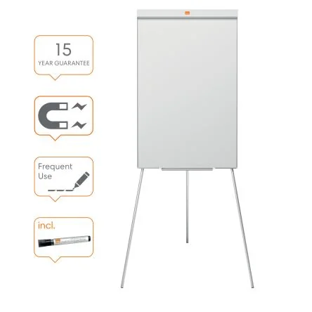 Sturdy tripod flip chart stand with whiteboard backing and pen tray for effective presentations.