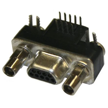 Compact 9 way D-sub connector with right angle design and secure PCB mounting.