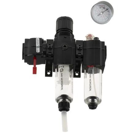 Norgren BL74 Series - Filter Regulator and Lubricator. IMI Norgren BL74 series filter, regulator and lubricator combination sets are fitted with quick-release bayonet bowls, making the device easy to maintain. This Excelon design is a comprehensive range of modular FRL air preparation units supplied as separate units, boxed sets. Features and Benefits. ;ul> ;li>Complete air processing units that are pre-assembled and ready to install straight from the box ;/li> ;li>The regulator has a micro fog lubricator to ensure the best lubrication ;/li> ;li>40µm Polypropylene filter element ;/li> ;li>Complete with gauge and quickclamp mounting bracket ;/li> ;li>Quarter-turn manual drain ;/li> ;li>All-round visibility on drip sights ;/li> ;li>Push-to-lock knobs on regulators ;/li> ;li>Balanced valve for improved regulation ;/li> ;li>Maximum inlet pressure 10 bar ;/li> ;li>Temperature range -20°C to +50°C ;/li> ;/ul>