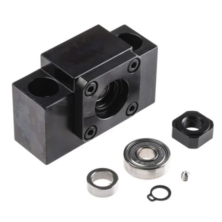 Rolled Ball Screws - Support Bearing Unit. Rolled ball screws offer a quick and economical method of assembling a highly accurate, repeatable and smooth operating linear motion system. Interchangeable threaded shafts and nuts in 14, 20 and 25mm diameters. The threaded shaft is not machined so it can be modified to an application dimension or a standard mounting nut kit is available. The threaded shafts are available in a range of lengths and leads. Each support bearing unit contains a housing with seals, bearings, retaining cover, spacer, lock nut and locking screw. The screw shaft requires machining to suit a support bearing unit. The same support unit is required for 20 and 25mm diameter systems.
