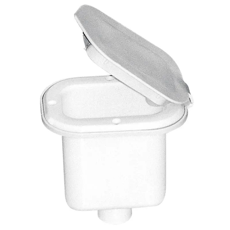 Rectangular shower box made of white plastic, designed for embedding in boat bilge surfaces or decks. Product from Nuova Rade, known for durability in marine environments.