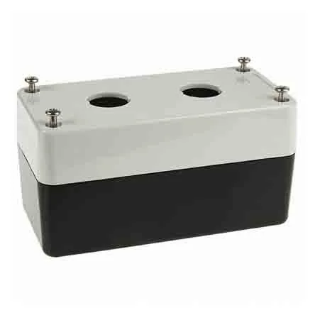 The Omron control box enclosure is an accessory for A22E pushbutton switch. This control box has two holes. It support 2NO, 2NC, or 1NC + 1NO two contacts switch blocks.It is made of polycarbonate resin It offers easy mounting and removal of switch unit It can hold two contact blocks