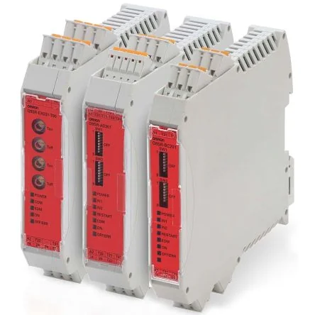 Omron G9SR Configurable Safety Relay. The three models of the Omron G9SR safety relays cover virtually all common control system safety requirements in standalone applications. They feature front-panel DIP switches for fast, easy configuration and customization, together with LED indicators for quick status monitoring and fault diagnosis. The key characteristics of the G9SR include certification to category PLe in line with EN/ISO 13849-1, fast response time to ensure minimum stopping times, solid-state outputs for long-life wear-free operation, compact housings to save space in control panels and removable spring-type terminals to ensure rapid straightforward installation. All units are equipped with an additional monitoring output to provide diagnostic information for use by the standard control system. G9SR Series Basic Unit. The G9SR Basic Unit is just 17.5 mm wide and has single or double channel safety inputs, plus double channel solid state safety outputs. The outputs are rated at 2A, which makes them suitable for direct switching of even large contactors. Features and Benefits. Compatible for a variety of safety solutions like E-Stop, guard monitoring devices, light curtains and others Fast response time for short safety distance Semiconductor outputs for wear-free operation DIP-switch configurable for fast setup/customized function Removable spring-type terminals for fast installation Certified to PLe category (EN/ISO 13849-1) standards. Basic Unit Stock number ; 8603773 8603773. 2P ch MOSFET. G9SR Series Advanced Unit. The G9SR Advanced Unit is 22.5 mm wide and has single or double channel safety inputs, plus double channel safety relay outputs rated at 5 A. For applications where input expansion is needed, each advanced unit can control up to two G9SR basic units that are configured as additional safety inputs to the same safety function. Features and Benefits. Compatible for a variety of safety solutions like E-Stop, guard monitoring devices, light curtains and others Safety relay outputs with 5A loading DIP-switch configurable for fast setup/customized function Removable spring-type terminals for fast installation Control centre for input/output extension modules Certified to PLe category (EN ISO 13849-1) standard. Advanced units stock number ; 8603770 8603770. 2 PST-NO (normally open). G9SR Series Extension Unit. The G9SR Extension Unit is 22.5 mm wide and has three safety relay outputs rated at 5 A. These outputs can be configured for instantaneous operation or to provide independent safe on and off delay timers that can be set in sixteen steps to give a maximum delay of 90 seconds. Up to three G9SR output expansion units can be connected to an advanced unit to provide one instantaneous safety output on the advanced module plus three time controlled safety outputs on the extension units.