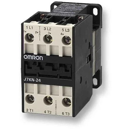 The Omron J7KN series motor contactor has 3-main-poles.This modular system consists of main contactors and additional contact blocks. The basic units can be combined with auxiliary contacts.AC and DC operated Integrated auxiliary contacts Screw fixing and snap fitting System contactors for Fuseless Load Feeders with integrated link modules Finger proof (BGV A2)