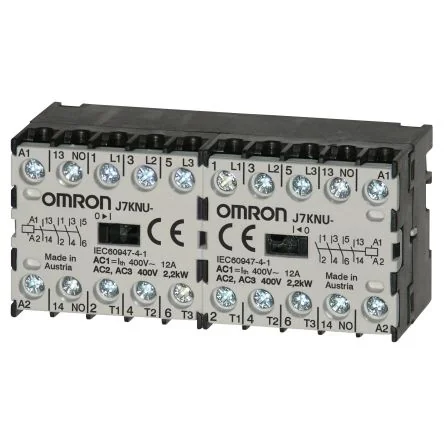 The Omron J7KNU-AR series contactor relay which has coil voltage 180 ac and has current rating of 5 A. It has electrical connection of screw fixing and snap fitting on a DIN-rail. It has dimension of H33 x W35.5 x D35.5.Ambient operating temperature -40 to 60 °C Finger proof