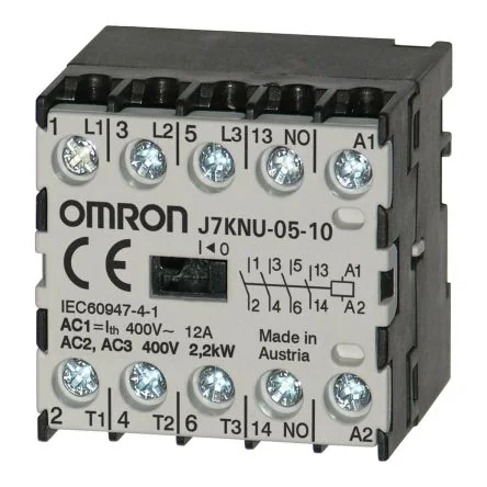 The Omron J7KNU series motor contactor which has coil voltage 230 V ac and has current rating of 12 A at AC1 up to 440 V rated voltage. It has electrical connection of screw fixing and snap fitting on a DIN-rail. It has dimension of H33 x W35.5 x D35.5.Ambient operating temperature -40 to 60 °C Finger proof