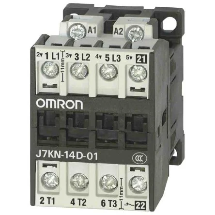 The Omron J7KN series motor contactor has 3-main-poles.This modular system consists of main contactors and additional contact blocks. The basic units can be combined with auxiliary contacts.AC and DC operated Integrated auxiliary contacts Screw fixing and snap fitting System contactors for Fuseless Load Feeders with integrated link modules Finger proof (BGV A2)