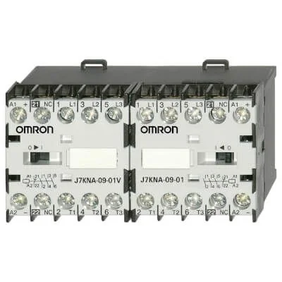 The Omron J7KNA series reversing contactor which has coil voltage 24 V ac and has current rating of 9 A. It has electrical connection of screw fixing and snap fitting on a DIN-rail. It has dimension of H57.5 x W94.5 x D50.Ambient operating temperature -40 to 60 °C Finger proof