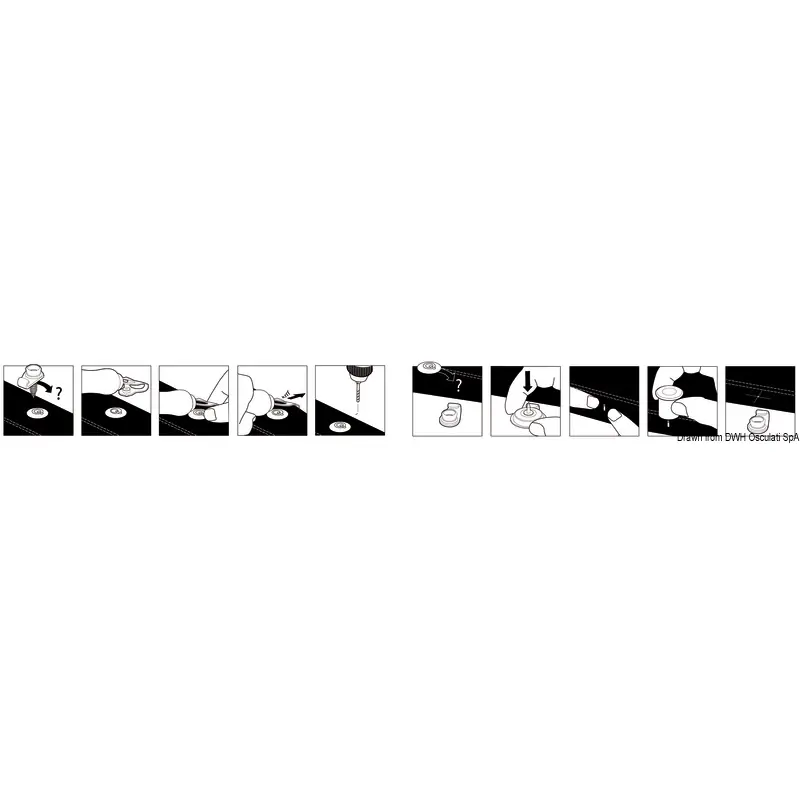 Stainless steel buttons AISI 316.The male part features a latching tooth for the female, which in turn has a specific retaining lip. The two innovations combined allow for optimal tensioning of the cover while preventing accidental release.