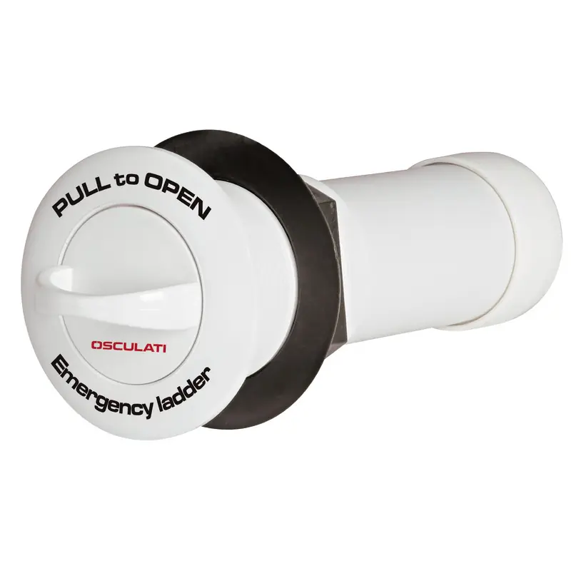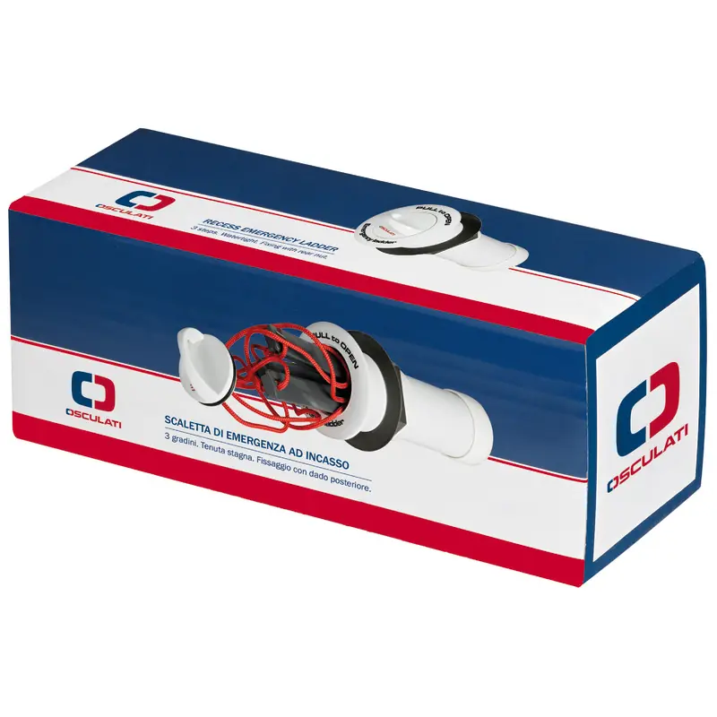 Watertight thermopolymer housing. Ladder with nylon braid structure and highly resistant thermopolymer steps. To be installed above the waterline. Very simple to use: in a man-overboard situation, the crew member in the water pulls the locking cap ring to let the ladder out of its housing. Sold in display package.
