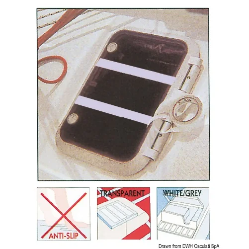 Anti-skid adhesive tape, provides an antiskid surface on all type of boats without altering the aesthetics; clear adhesive tape for hatches, white adhesive tape for fibreglass decks.