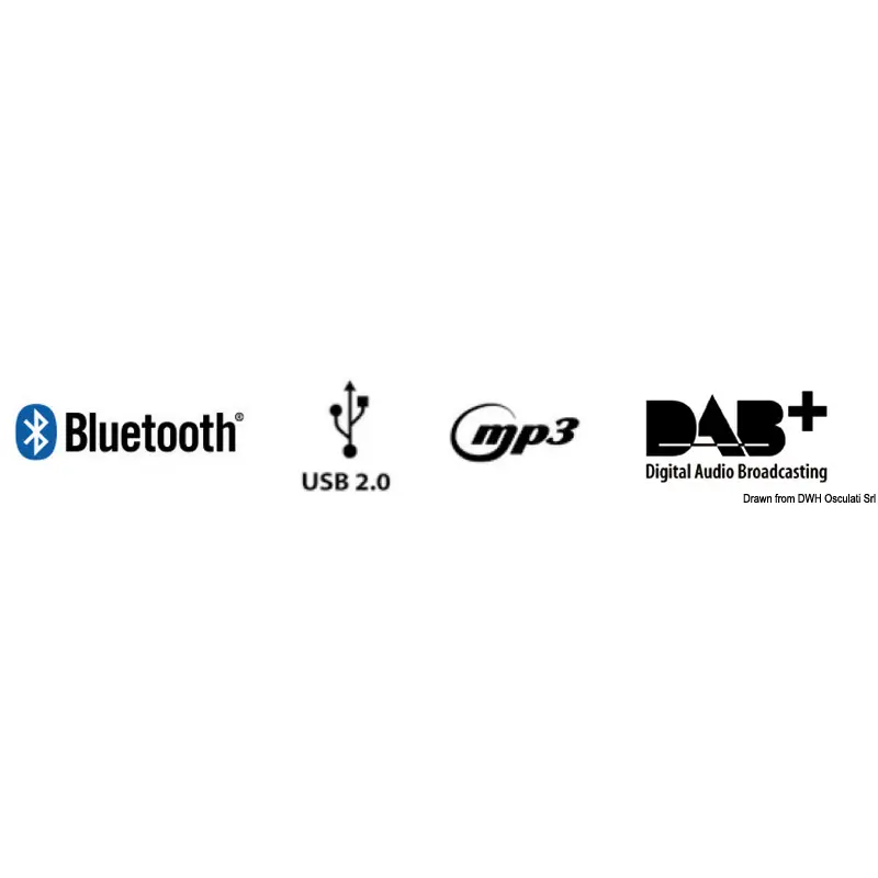 - Supported Media: Bluetooth, USB, MP3, AM, FM, DAB (with adapter 29.548.83), AUX (with rear USB connector).- Display: TFT screen.- Inputs: Bluetooth, 1xUSB, 1 pair of RCA.- Outputs: 1 pair of 2V RCA pre-out.- AM/FM Tuner.- Power (max): 4x45W (4 Ohms), 4x72W (2 Ohms).- Output voltage: 10.5 V – 14.4 VDC.- IP65 waterproof.- Accessories: clock (included).- Additional features: stainless aluminium, silicone dashboard cover, 2 x external triggers (12V, 3A) for connection to amplifiers.
