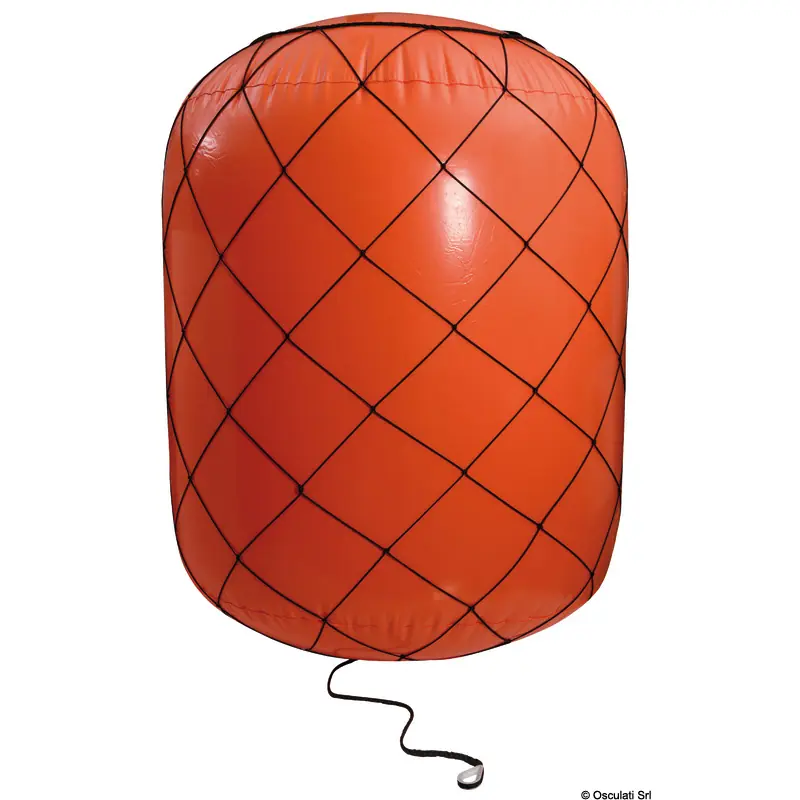 Giant inflatable buoy in PVC, cylindrical in shape, designed to signal turns on regatta fields. Equipped with a quick inflation / deflation valve and 4 lower cable passes for lead fixing, allowing for even weight distribution. Complete with one or two transparent side pockets for inserting logos and / or advertising messages. Optional anchoring net in levilene to insert the buoy at the time of inflation, to better distribute the traction in water.