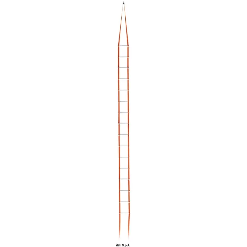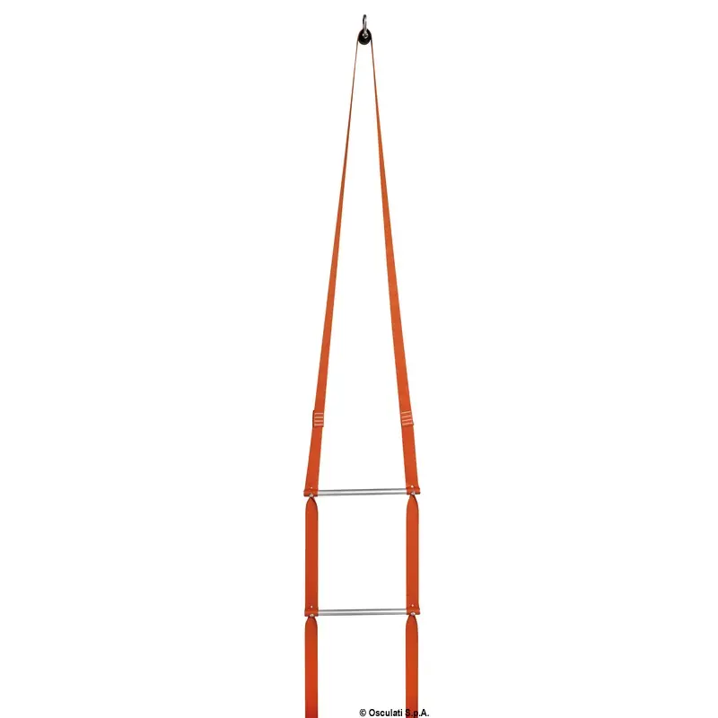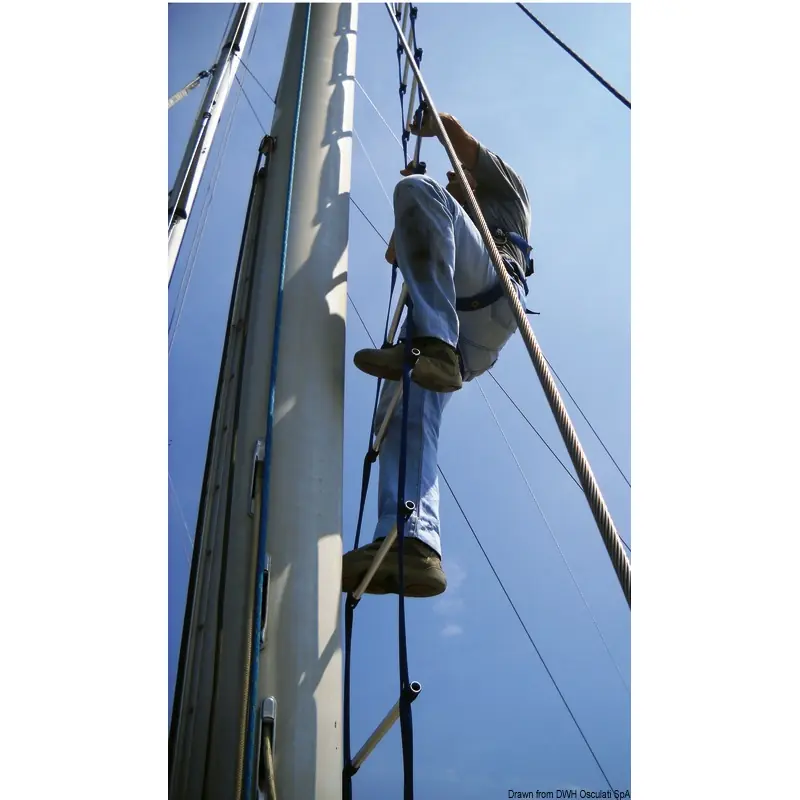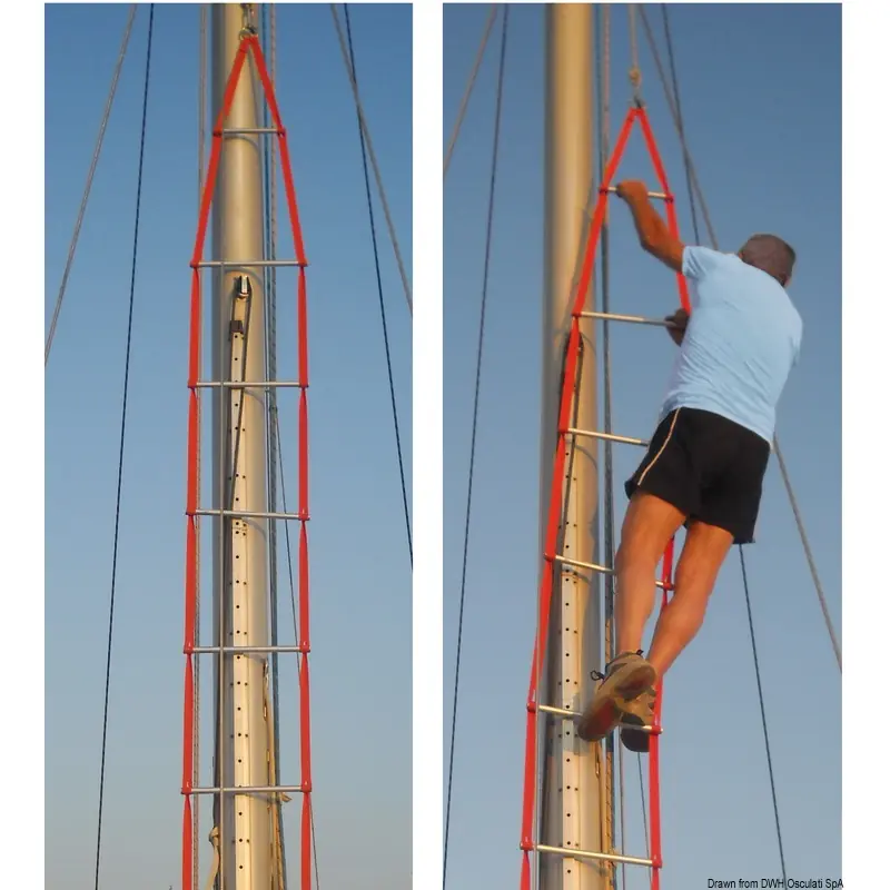 Made from textile tape and aluminium steps. The ladder must be fixed at the bottom to the two prepared loops (ideally fixed under the boom attachment) and then tensioned with a halyard; once well tensioned (via winch) the ladder will be rigid and stable thanks to a self-choking system on each step. Even if one leans over, the ladder remains firm and does not rotate on itself. The total length of the ladder must be less than the length of the mast to allow it to be tensioned to the maximum. When the tip is tensioned, the ladder allows a man with his feet on the top step to have the masthead at about chest height. It is still possible to find the correct size by working on the tails prepared for adjustment. See instructions.