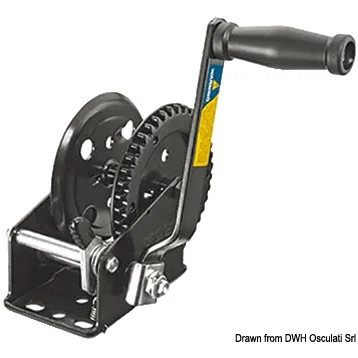Chromed-zinc steel body, high-resistance hardened steel pinions, self-lubricating bushing, reinforced handles, stainless steel springs, cased gearing. Black epoxy powder coated. CE certified by TÜV.The maximum traction load refers to the use with only one cable turn on the drum.