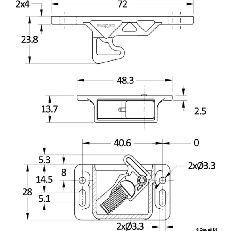 The latch closure is facilitated by the use of a mechanism with a relatively low profile (only 13.7 mm thick). The actuation above the dead point firmly compresses the door, releasing the compression upon opening.Features:- The latches can be mounted vertically or horizontally, the marks on the latch and the hook are a reference for correct mounting.- Available in various mounting options: the hook can be installed in front of or beside the frame.- All models have three clamping forces: 13 N, 22 N and 44 N.- All models are made of corrosion-resistant materials.