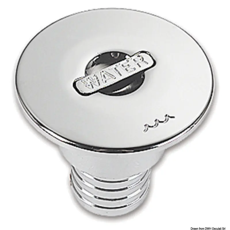 Fitted with special opening system that avoids the use of keys, coins or any other device. Designed to cover the flange completely, thus improving its watertight features. Version fitted with straight or 30° sloped joint pin (to be used when the fueling surface is sloped, in accordance with ISO 8099/1 standards). Fitted with small internal chain, 88-mm max Ø. RINA type-approved.