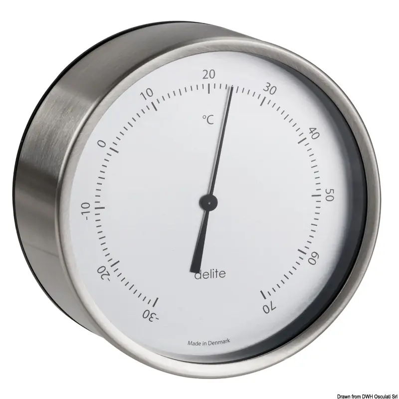 Stylish wall-mounted thermometer in satin stainless steel for accurate temperature readings.