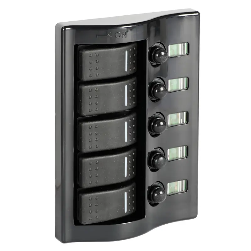 Durable control panel with 5 flush rocker switches and LED indicators for marine use.