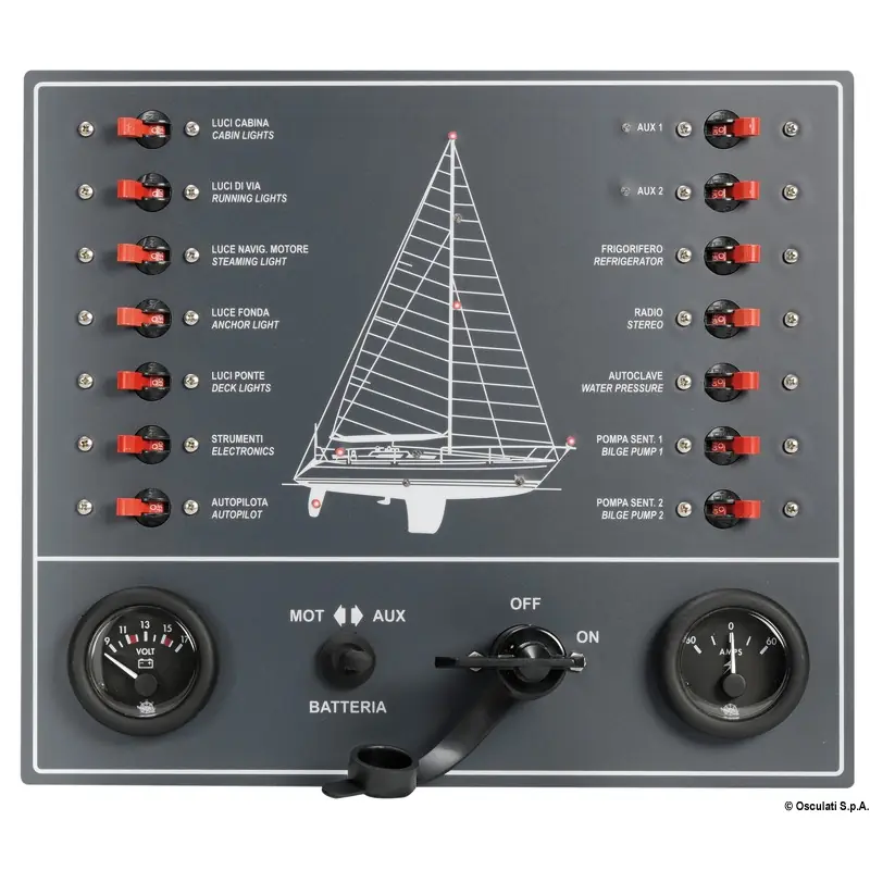 Enhance your sailboat's electrical system with Osculati's control panel featuring LED indicators and reliable thermo-magnetic switches.