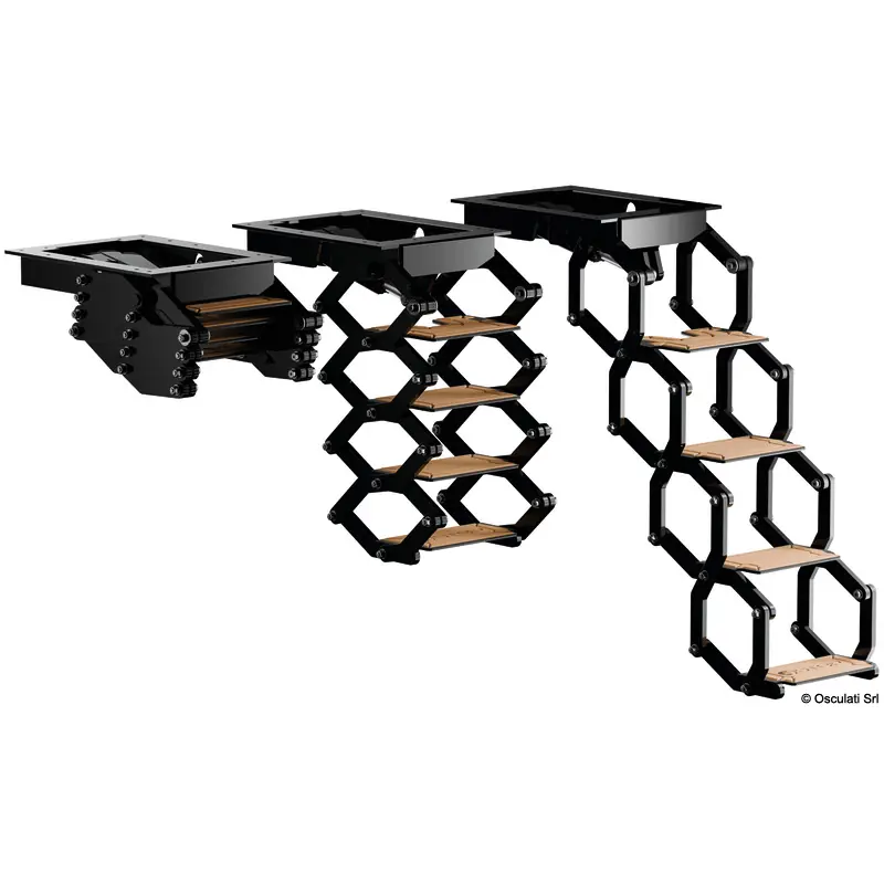 Electric under-platform ladder with innovative and patented pantograph system.Made of lightweight aluminium alloy to ensure the correct strength and lowest possible weight. The steps are covered with a non-slip EVA layer to ensure comfort and safety.Powder-coated in glossy black, it is available in two versions with 3 or 4 steps.The first step of the ladder is designed to protrude forward, allowing back installation with respect to the transom.The “all-in-one” ladder with quick installation and IP69K motor is provided with a dedicated control panel for operation.Extremely low-noise and quick to fold and unfold in 12 seconds.It is a patented and innovative product, 100% Made in Italy, that bridges the gap between mechanical climbing ladders and expensive electric gangways.Possible customizations on request: color of steps.