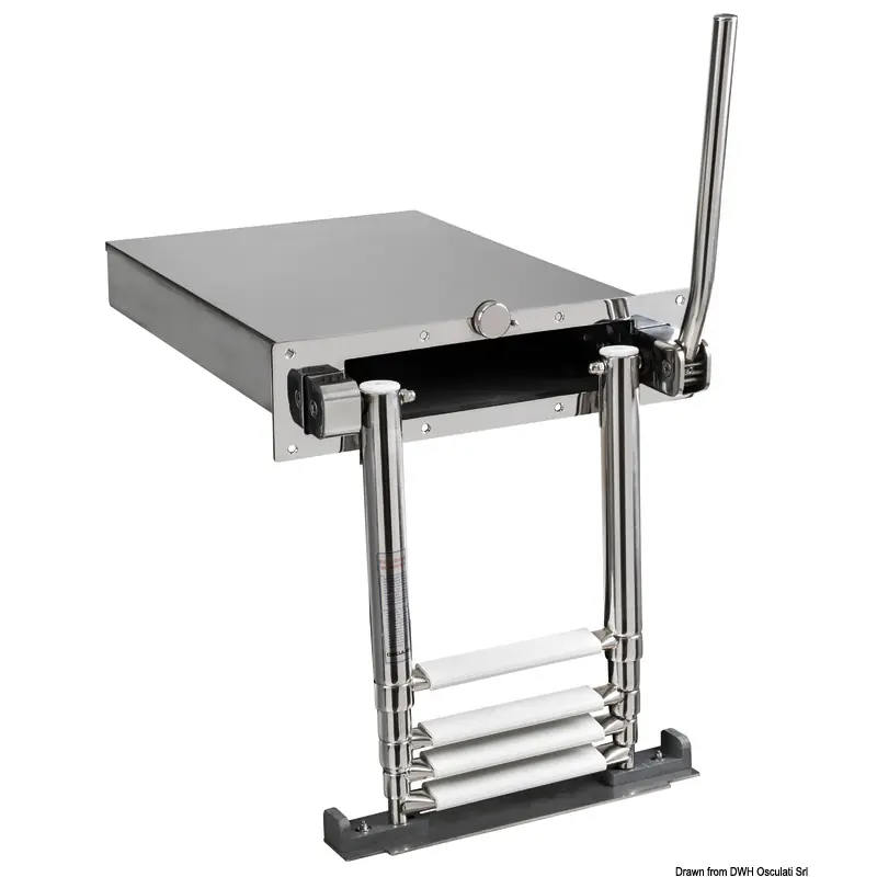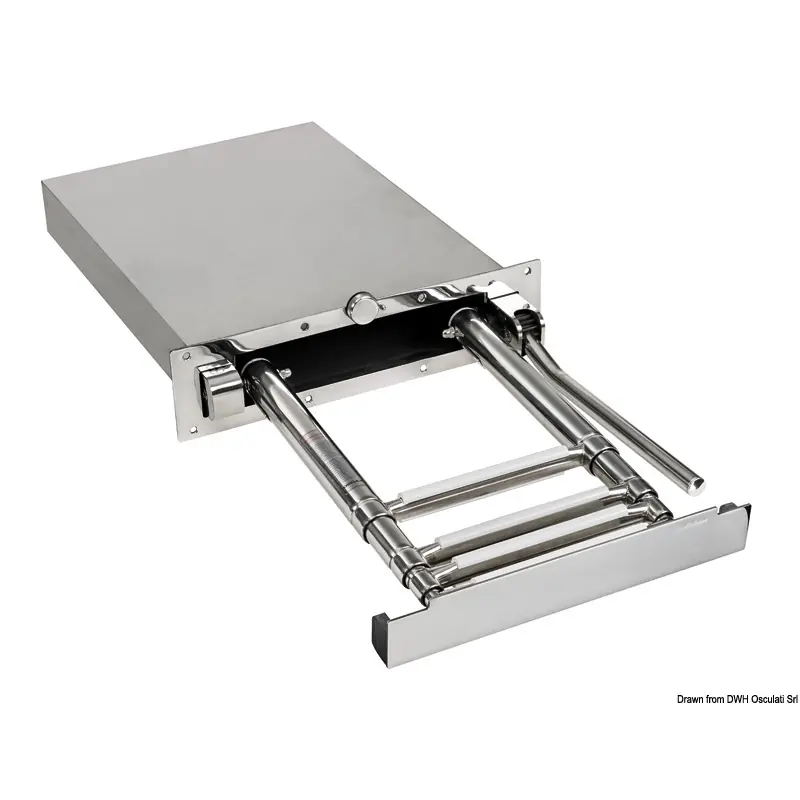 4-step recess-fit AISI316 stainless steel telescopic ladder. Fitted with built-in railing that automatically raises and lowers when you rotate the ladder.The railing closing system makes it easier to retrieve the ladder from the gangplank. The ladder has a guided pull-out system for better and more precise sliding.