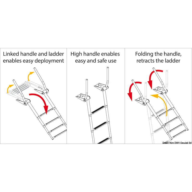 The holding handle rises and lowers when the ladder is deployed.Extra-large step (52.5 mm).Mirror-polished AISI316 stainless steel.
