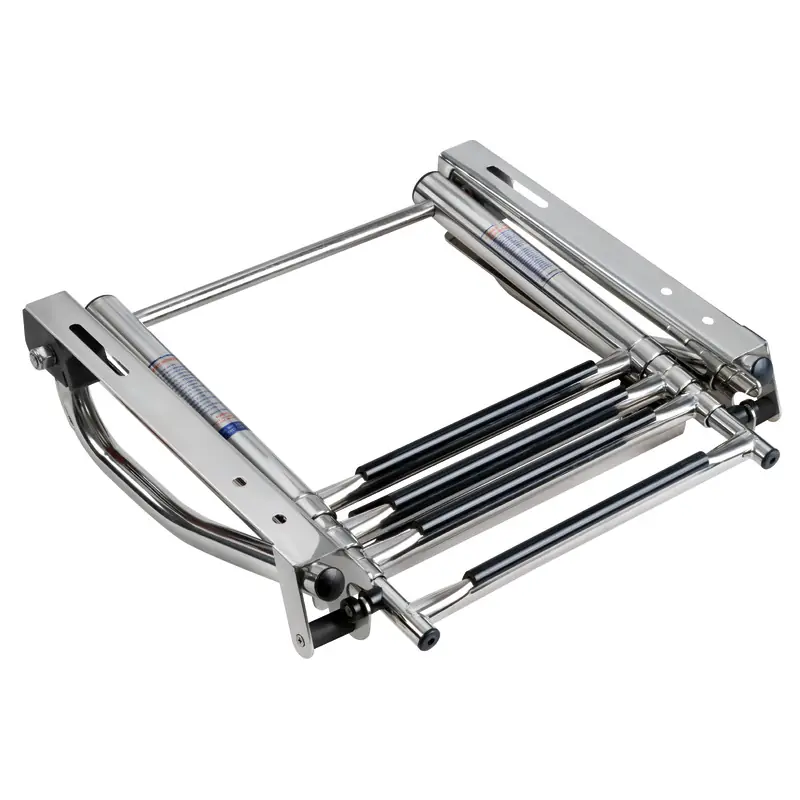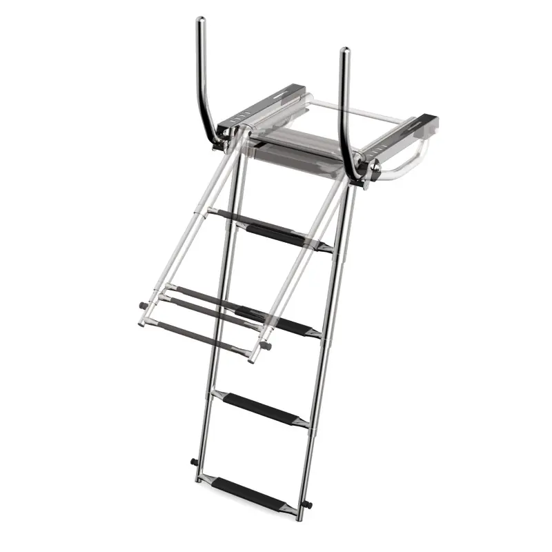 Under-platform 4-step telescopic ladder made of AISI316 stainless steel.Fitted with overhanging rungs that make it easy to pull out the ladder and built-in climb-back handles that open and close automatically when pulling out or closing the ladder.43-mm black plastic rungs for better comfort.