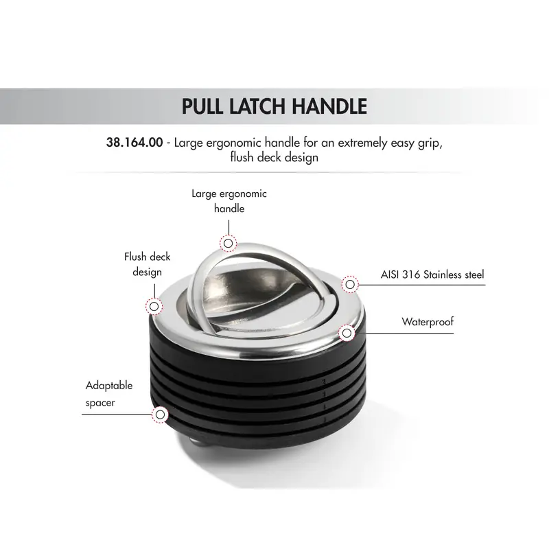 Featuring an extremely easy grip:- 316 mirror-polished stainless steel;- Flush deck design.- large ergonomic handle;- Spring retractable handle.- plastic spacer with invitations for custom cutting.