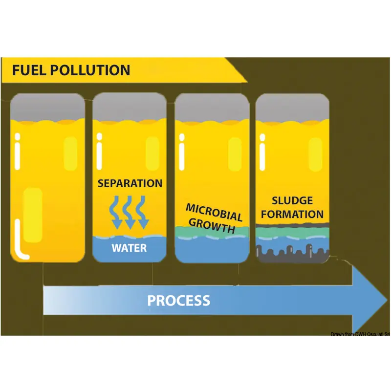 Bacterial contamination of diesel is a very serious and complex problem that has become increasingly widespread lately. Unlike "classic diesel sludge" (paraffins, carbon residues, and tars), which are made fluid by Fastol and reintegrated into the fuel, bacterial sludges are only soluble in acids. Just a few ppm of water is enough to promote the growth of such bacteria. The residues produced by the bacterial colony appear in the form of mucilage, algae, mold, or filaments, rapidly increasing and clogging filters and pipes, causing malfunctions and even engine shutdown. Their proliferation also triggers corrosion processes in the tank. ECO-BACT H-Power is a biocide that is enhanced in its active ingredient: while maintaining the effectiveness of the previous formulation, it requires lower doses with very low operating costs. It is soluble in both water and diesel and concentrates in the aqueous phase of the diesel, where the concentration of contamination is highest. ECO-BACT H-Power can be used both to remediate an already contaminated tank and as a periodic treatment for prevention and/or maintenance.