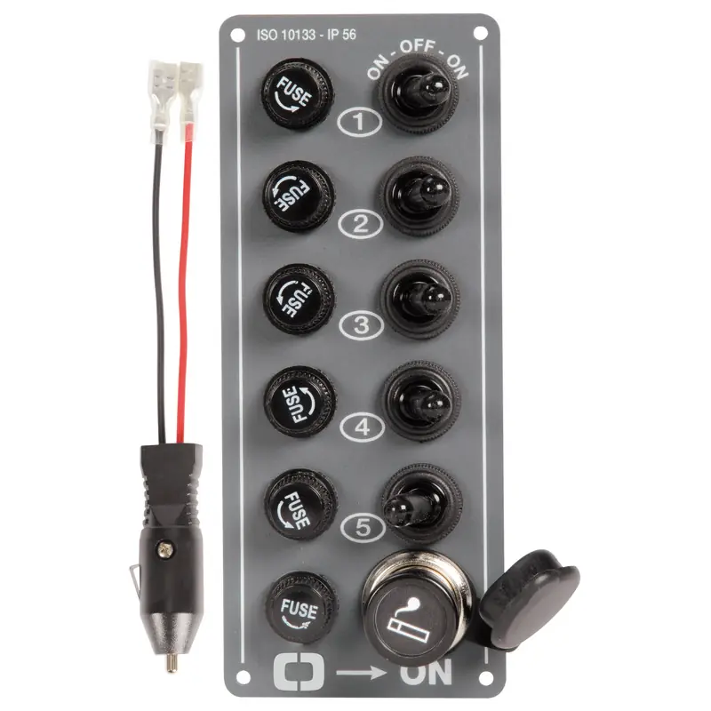 Durable electric control panel with 5 switches and a lighter plug, perfect for marine applications.