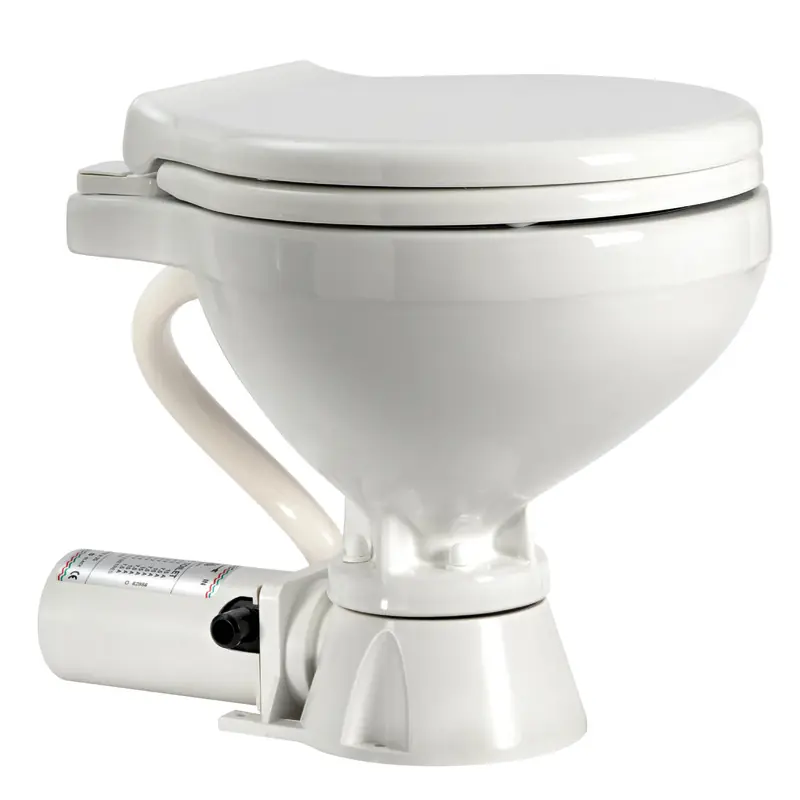 Compact electric toilet unit with a powerful self-priming pump for efficient marine use.