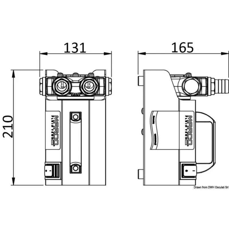 Blade impeller. Aluminium body with quick fitting for 25-mm hose. Case with handle, ON/OFF switch, battery clips. Fitted with EMI strainer. Pump suitable for transfer from a tank to another.