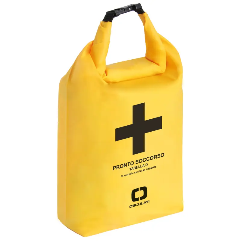 Content: 1 bottle of hydrogen peroxide 250 ml; 1 adult AMBU resuscitation bag; 1 adult oronasal mask size 5; 1 pediatric oronasal mask size 2; 1 nitrile tourniquet; 1 latex-free hemostatic strap; 10 high-edge sterile bandages 10 cm; 1 instant ice pack (ICE PACK); 2 adhesive plasters 10x6 cm; 8 compressed cotton pads 125 g; 1 Lister scissors 14.5 cm DIN; 1 Lister scissors 19 cm DIN 58279-A190; 5 sterile gauze packets 18x40; 5 sterile gauze packets 20x20 (5x5); 5 pairs of sterile NITRILE gloves size L; 5 pairs of sterile copolymer gloves one size; 1 mini container for needle recovery; 1 personal sphygmomanometer with stethoscope; 1 flat stethoscope; 1 fracture splint; 1 clinical thermometer; 1 bottle of chlorhexidine 500 ml; 1 finger pulse oximeter; 5 sterile Steri-Strips 6 x 38 mm; 1 nautical label TABELLA D decree 2022; 1 gold/silver thermal blanket; 1 multilingual first aid manual 24 pages; copy of the MINISTERIAL DECREE DM 10/03/2022 with a list of medicinal specialties to be purchased at the pharmacy by the end user.