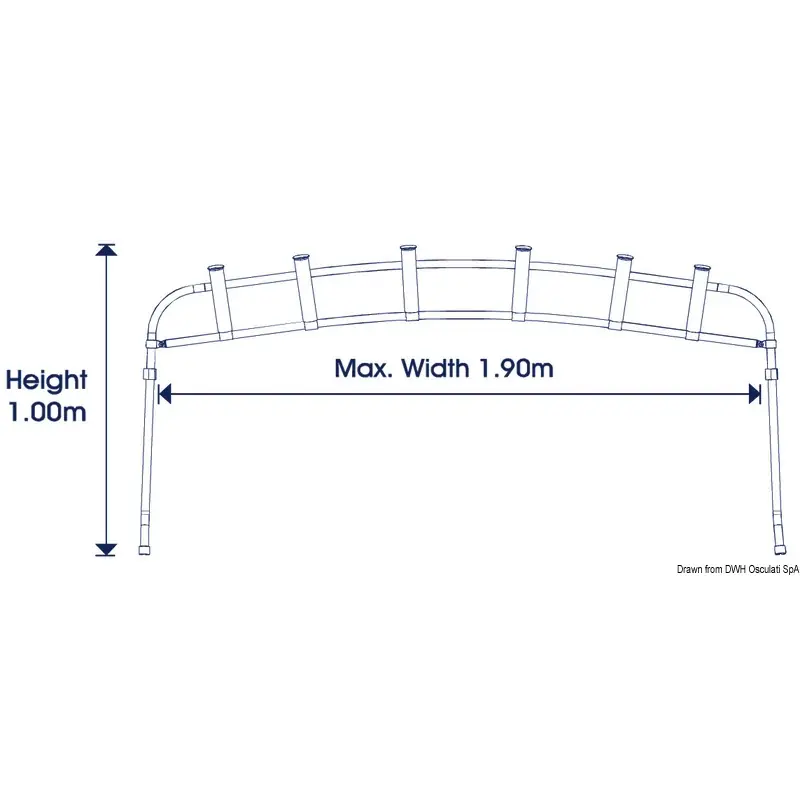 Designed to be fitted to any awnings with 25-mm Ø pipes and a maximum width up to 1.9 metres (the rack can be adjusted to fit narrower awnings). Anodized aluminium construction, 6 fishing rod holders.