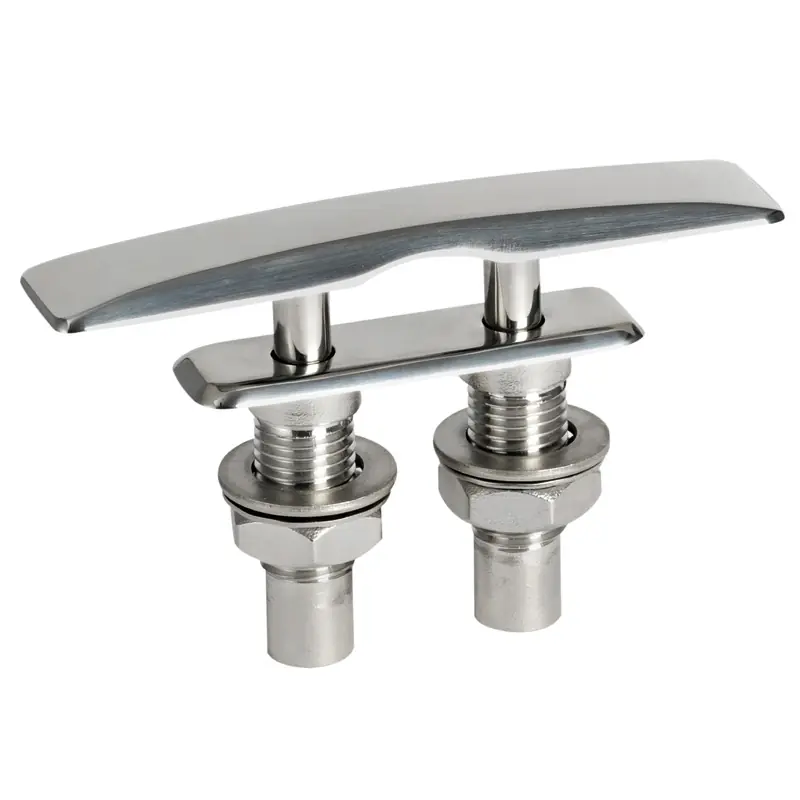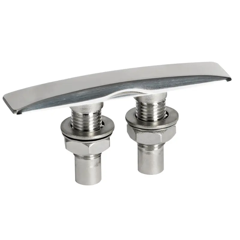 Durable flat push-up cleat made from mirror-polished AISI316 stainless steel for marine applications.