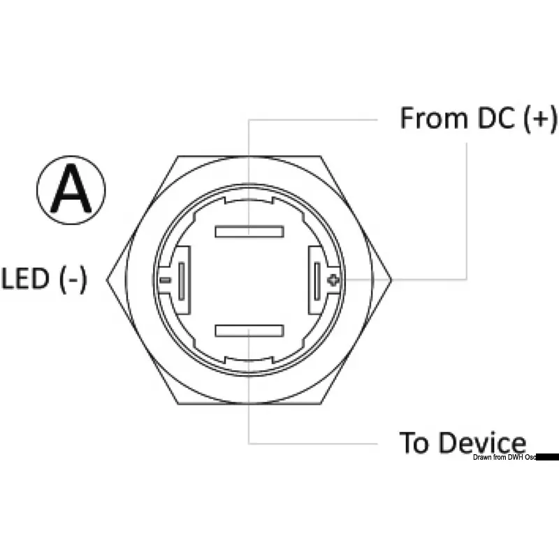 at 12 V.Waterproof IP67 (temporary immersion). LED light crown. Lifespan 20,000 cycles.A scheme wiring: LED light crown always on.B scheme wiring: LED light crown switched when in ON position.