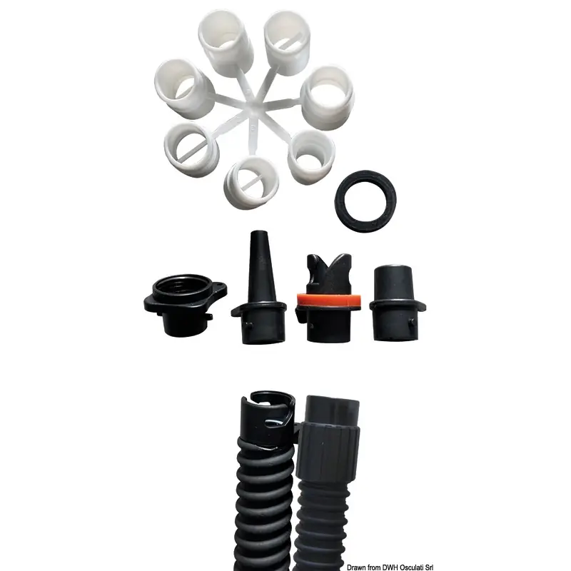 An evolution of the previous model, this inflator reaches a 1.2-bar (18 psi) pressure and is ideal for SUP boards.Automatic stop when the preset pressure, adjustable by means of a pressure gauge, is reached.Fitted with hose and bayonet connector, universal fitting kit, 2.5-m power cable and battery terminal pliers.Il comes in a convenient and sturdy shoulder bag.Average inflating time: 9’30’’ (265-litre SUP @ 1250 mbar).