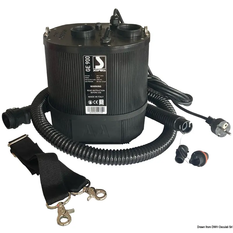 High-flow electric inflators to inflate tents, games, structures, and inflatable barriers (GE 900), kayaks, and any inflatable boat (GE 900AA+ PLUS) quickly and with significantly reduced noise impact (max 85 dB).Supplied with Ø 25-mm inflation tube 1.5 m long and universal fittings.