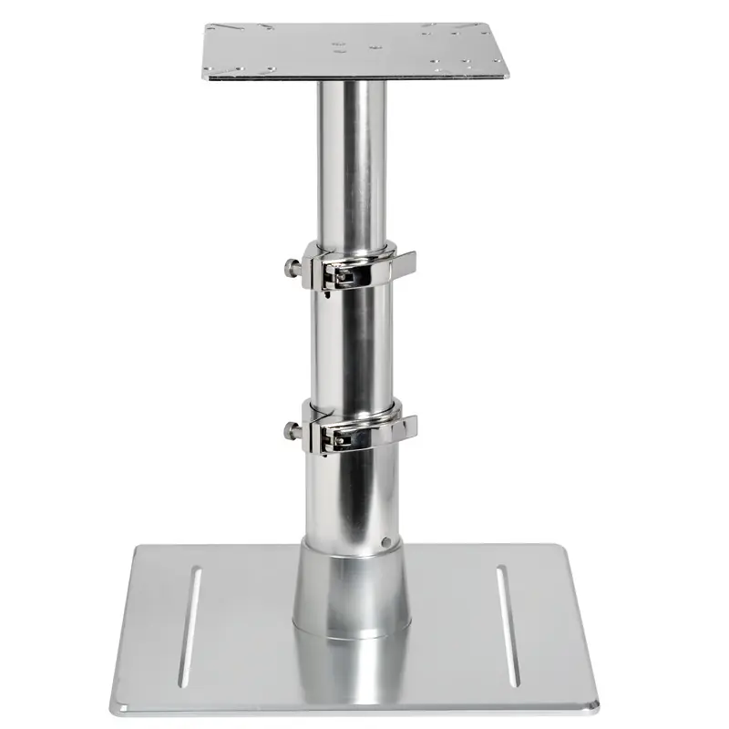 Made of mirror-polished anodized aluminium. Stainless steel clamping collars for a stable and sturdy pedestal. Fitted with gas spring for upstroke, no need to bore the floor for downstroke. Tri-telescopic. Polished and anodized aluminium base with milling finish for possible installation and sliding on the floor.