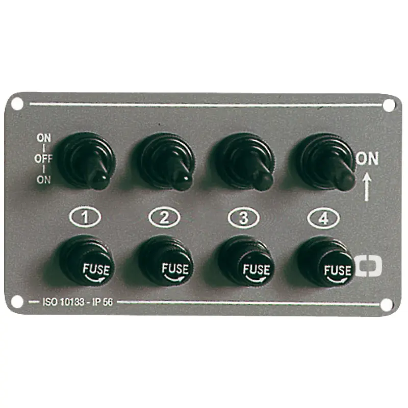 Protection level IP56. The first switch has 3 positions (ON-OFF-ON) with 2 separated circuits, the last has momentary ON position for horn. 15-A ensured load fitted with rubber cap and glass fuse holder size 6x32mm. Grey anodized aluminium panel.