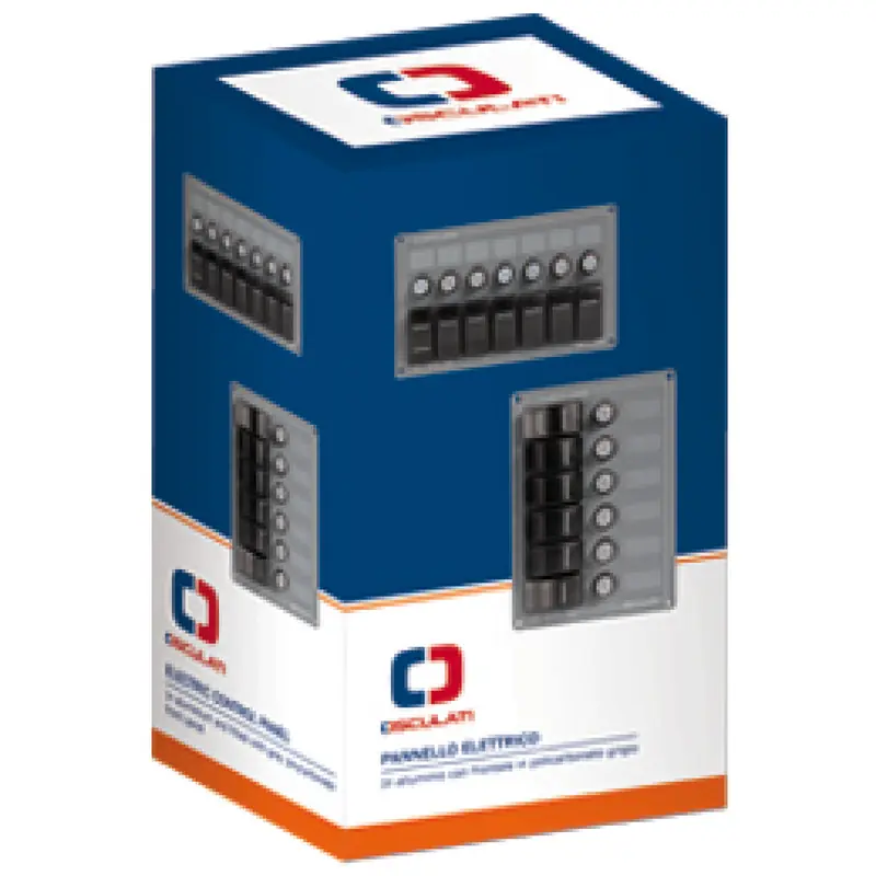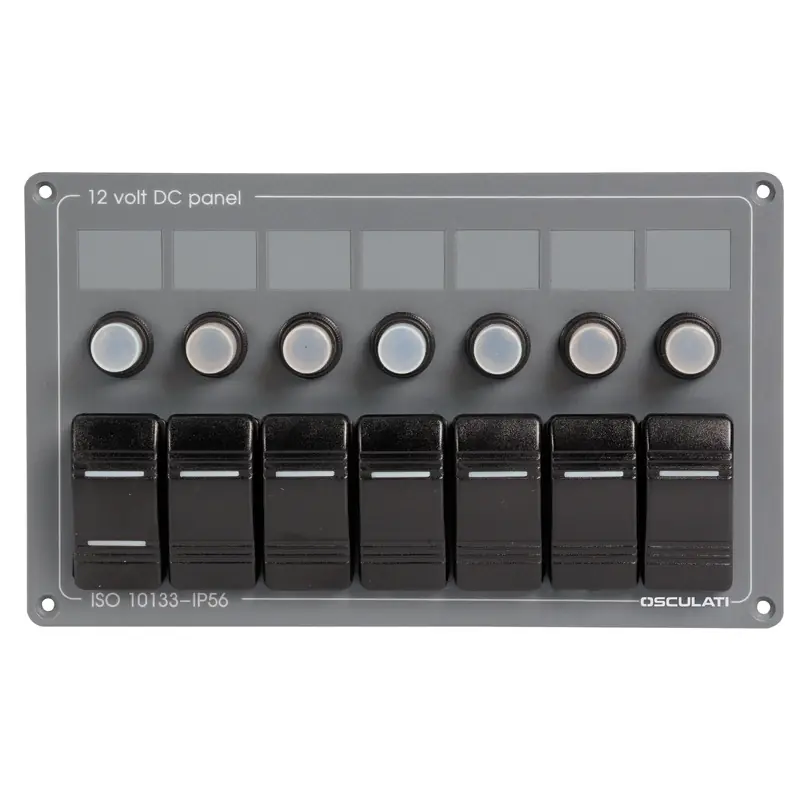 Equipped with watertight rocker switches, with built-in ON pilot light. The first switch has 3 positions ON-OFF-ON with two separate circuits, the last one is a spring switch for the horn. Supplied with automatic watertight fuses (14.845.06: 3 x 10 A, 2 x 15 A, 1 x 20 A; 14.855.07: 4 x 10 A, 2 x 15 A, 1 x 20 A). Protection level IP56. Includes polycarbonate self-adhesive labels, for various functions, in Italian, English and German.