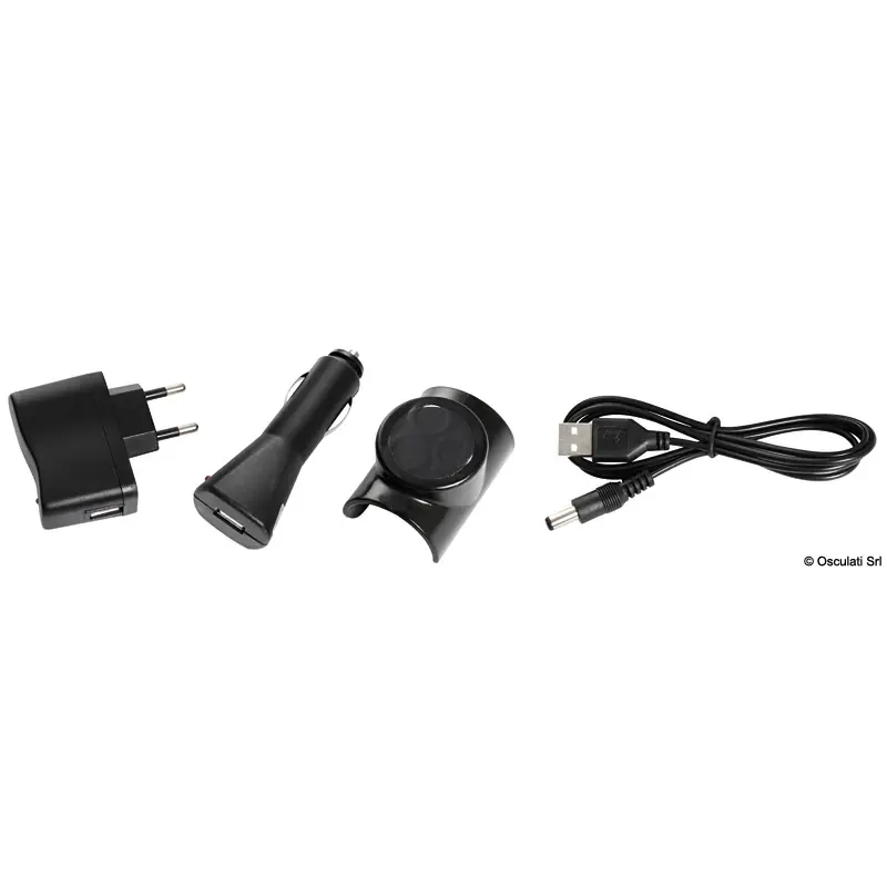 Power with internal rechargeable battery. Up to 6-hour capacity. 3-hour recharge time. Waterproof rubber body. Equipment accessories: 110/240 volt battery charger, 12 volt cable with lighter-type plug.
