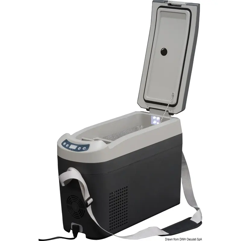 Compact and portable refrigerator/freezer with Secop BD Micro compressor. 12/24-volt supply. 35-watt consumption. Temperature adjustable by means of a thermostat. Made with stainless steel materials.