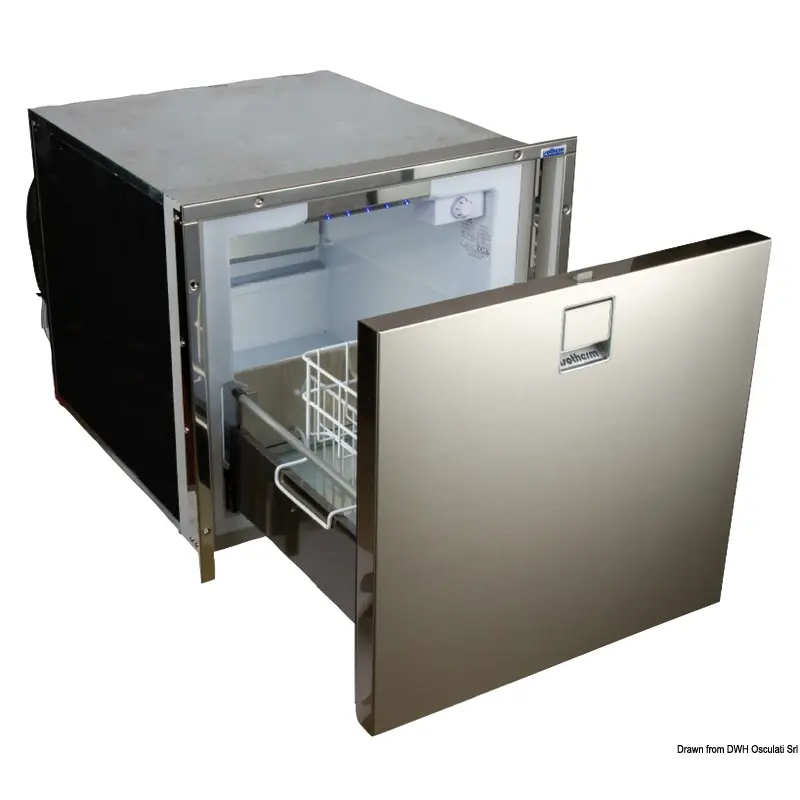 Series of refrigerator/freezer appliances with stainless steel front opening drawer and stop. With Secop compressor (12/24 V universal voltage).