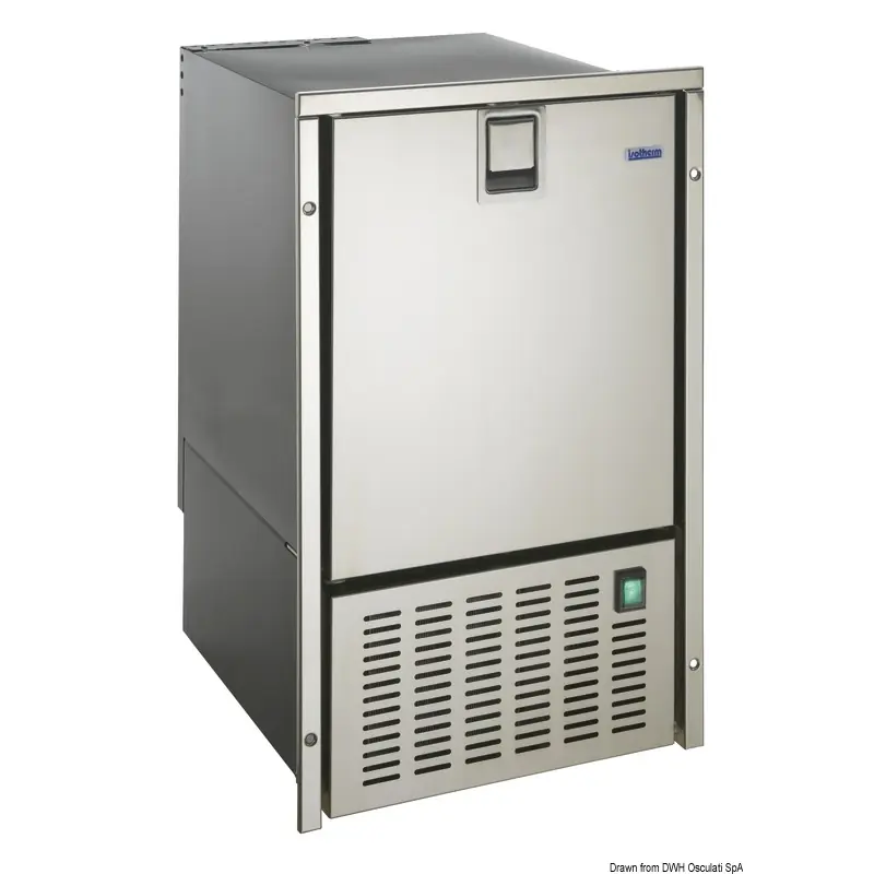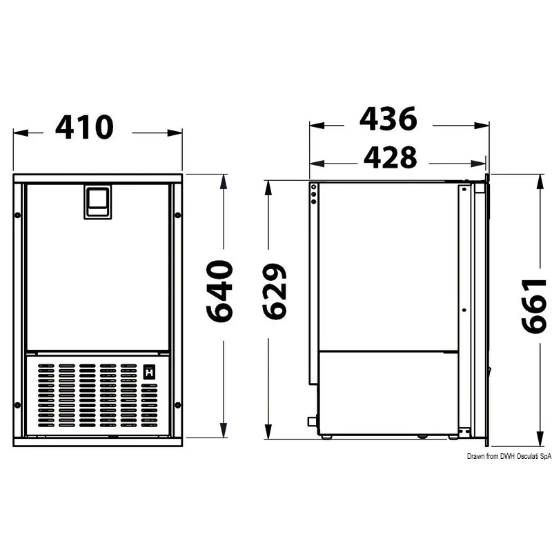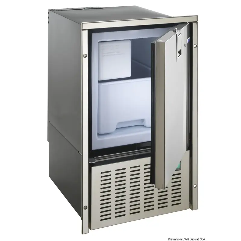 100% stainless steel, 8 kg/day ice production. Unique design and possibility of partial flush mounting with a complete frame or on 3 sides (lower flange to be bought separately). Ideal for applications at elevated external temperatures since the unique ventilation system pulls air in through the front. 180W power consumption and variable dimensions depending on the use of flanges. It is recommended to leave a 5-mm space on the ice maker rear part for water draining and relating connections. Weight: 29 kg.